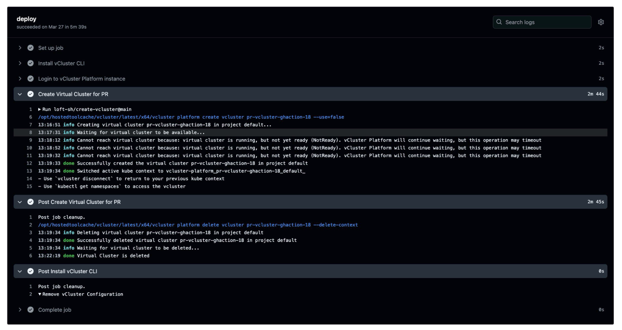 The simplest way to implement an ephemeral environment is to configure a new cluster for each pipeline, but considering the time it takes to provision a new cluster and install the required operators and configure connections, this process might be time-consuming. However, virtual clusters and auto clean up can solve these problems: