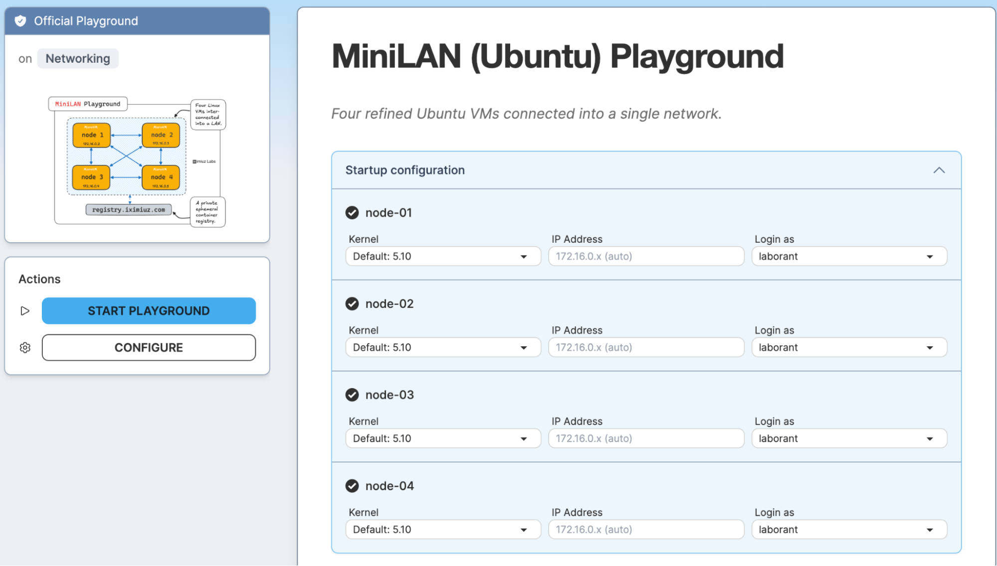 Once you start the miniLAN playground you will get access to 4 Ubuntu nodes where they are connected so that we can experiment and create a 4 node cluster.