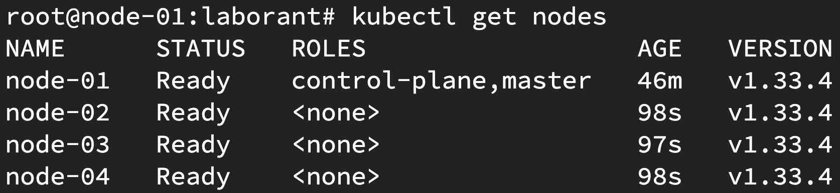 On VM node-02 (and any additional worker nodes), run the printed join command. E.g.: