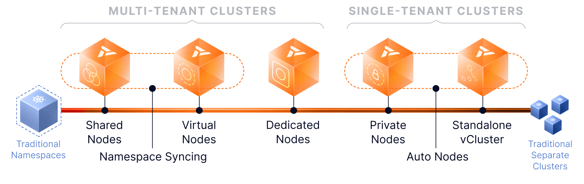 - With vCluster Standalone, and the recent release of Private Nodes, and Auto Nodes, vCluster now powers enables a broad selection of options across the multitenancy spectrum.