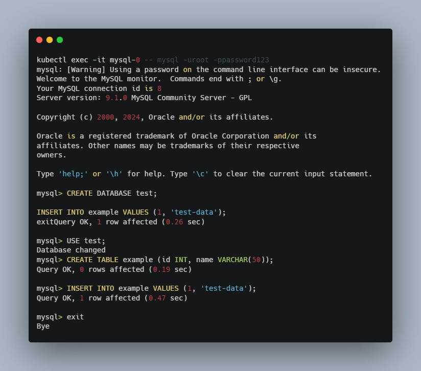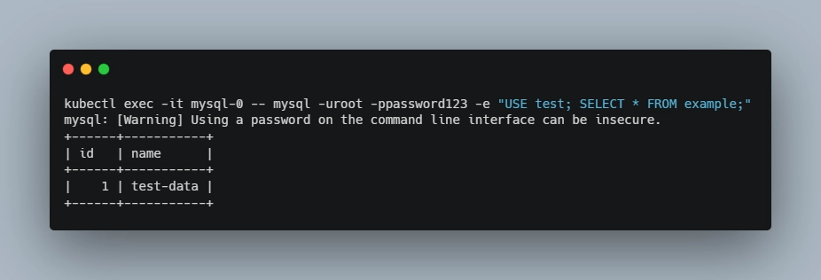 kubectl exec -it mysql-0 -- mysql -uroot -ppassword123 -e "USE test; SELECT * FROM example;"
