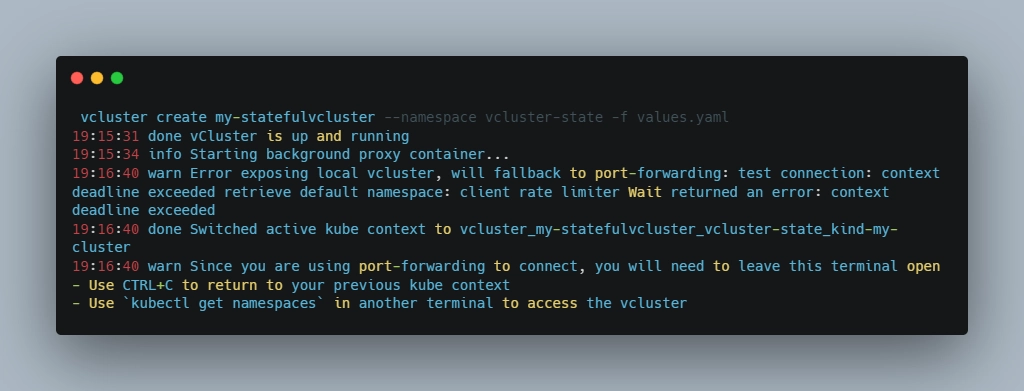 This command creates a new namespace (vcluster-state) in your current Kubernetes cluster and deploys a virtual cluster named my-statefulvcluster.
