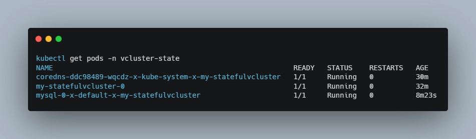 After connecting, you’re now within the virtual cluster my-statefulvcluster, which is completely isolated from the main Kubernetes cluster.