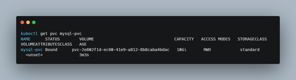 After this, check now the status of the PVC that you have created above, it's in the Bound status which means it is successfully linked to the PV and ready to be used by a pod.