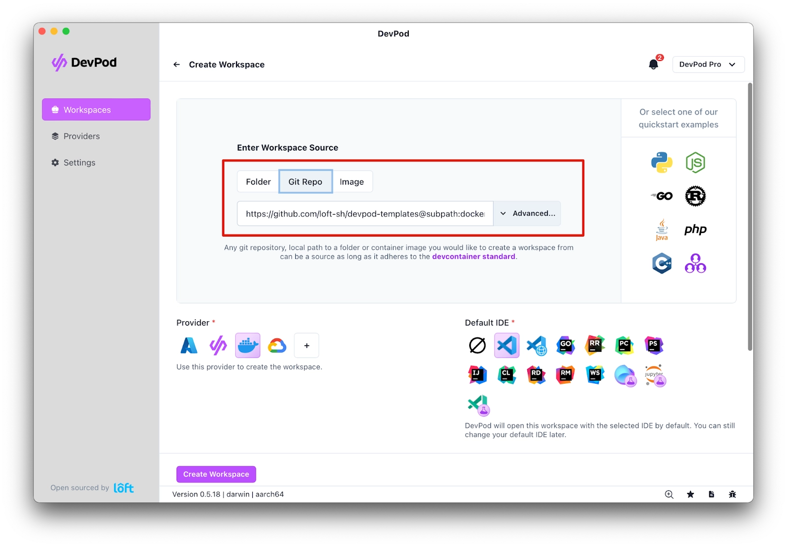 Once you've done this, you can proceed to the DevPod UI and reference your local/git repository.