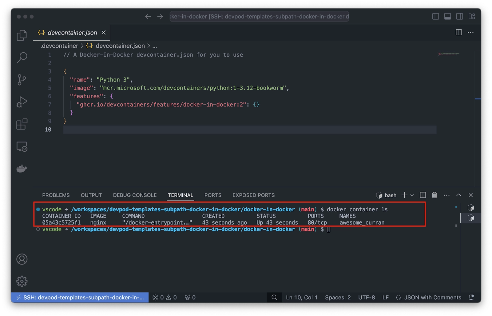 If you’re using DevPod for your workloads, then a case might arise where you want to have Docker installed on your remote workspace. Here comes the need for a Docker-in-Docker setup. This post shows how you can achieve that in a few simple steps by relying on the manifest that DevPod is built on i.e., devcontainer.json.