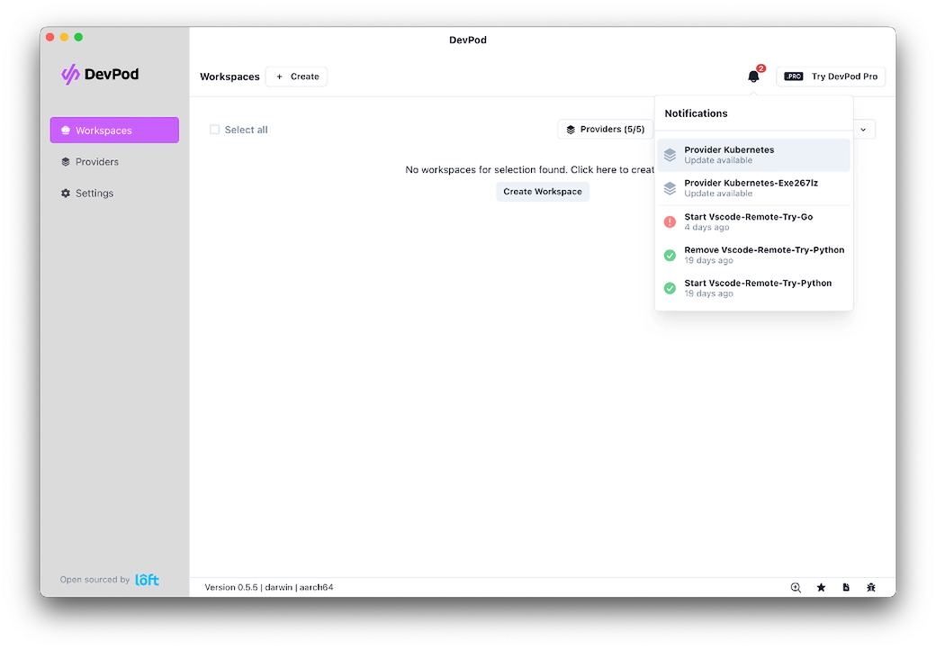 The list of providers is increasing with every version. Most users use more than one provider. With all these providers, it can be challenging to remember which one to update and when there’s a new version. With DevPod v0.5.5, you’ll get a notification on your UI prompting you for an update on the notification tab: