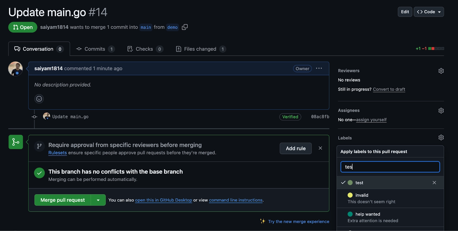 With a small change the developer has raised a PR and now needs to add a test label.