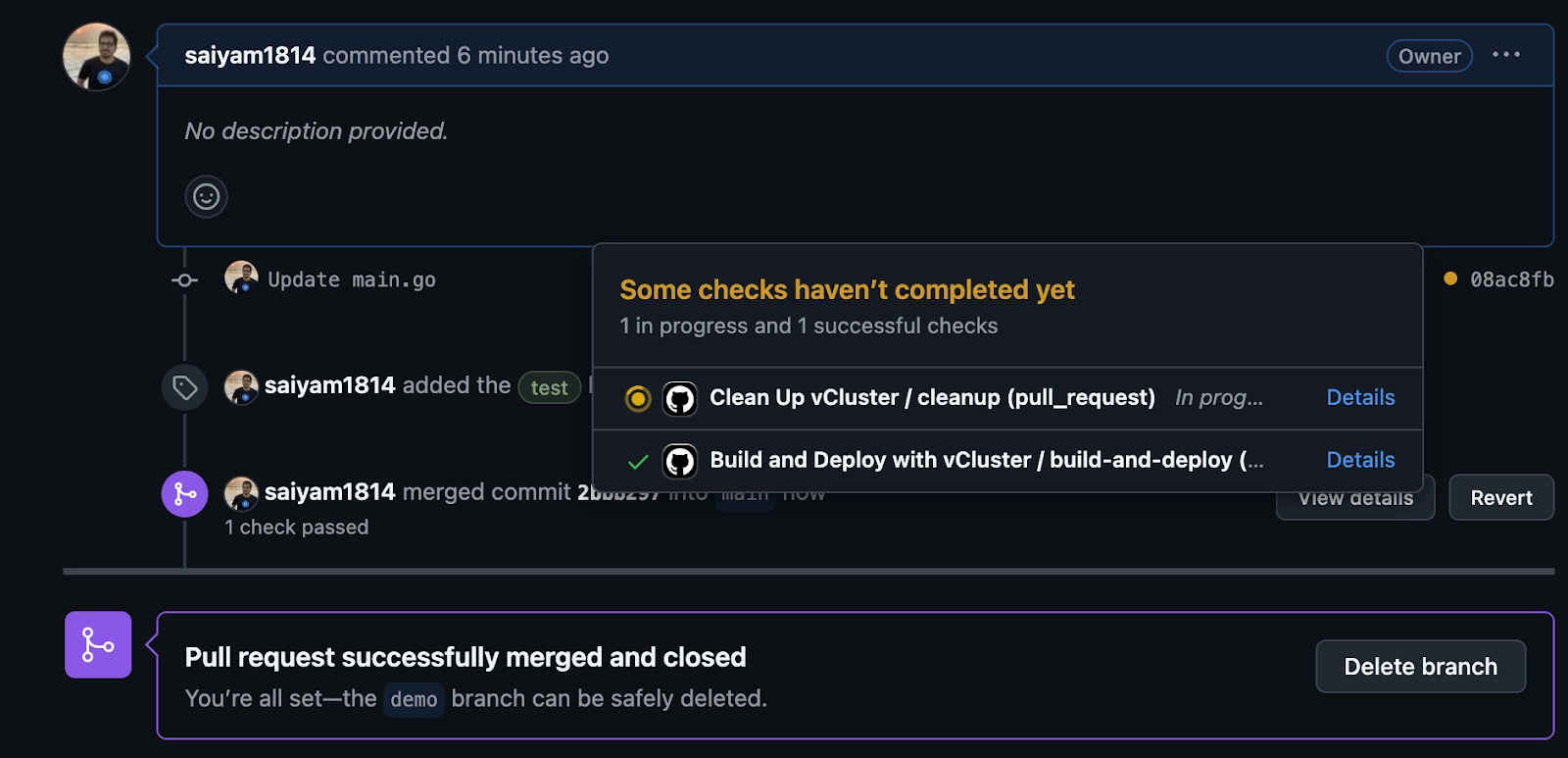 Once the PR is merged or the label is removed, the ephemeral vCluster is deleted.
