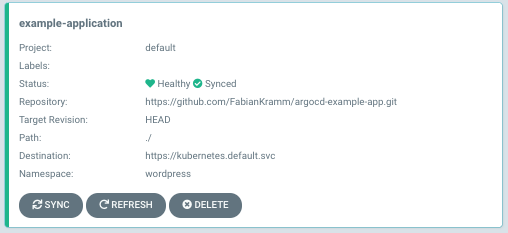 We can now delete the WordPress deployment with kubectl again and see that Argo CD will immediately recreate the deployment and the state from Git is synchronized into the Kubernetes cluster.
