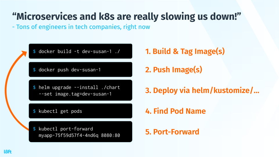 It's like finding the Pod name right because Kubernetes is distributed so we don't really know like there's no fixed name right? Our application is not called API server or something like that, our pod has some kind of suffix to it, so we gotta find that then copy it, then run a command like KubeCTL port forward. Well, guess what, if you want to make a change we have to start at the top again, and we can't skip any of these steps because well we do need a new image we need to push that new image we need a Helm upgrade again to upgrade this and then we need to find the pod name again because the pod name will have changed because Kubernetes will not recycle the name of this pod and then we start our port forwarding again to this new part that has been creating Kubernetes. So, that's not very very fast and efficient, right this is not our Heroku push, and it's accessible for us, so when people see workflows like this in the past couple of years, there has been a new trend emerging, which is actually an old trend and that is to reply to complexity which we need to pass because pass that was Heroku right that was my first example.