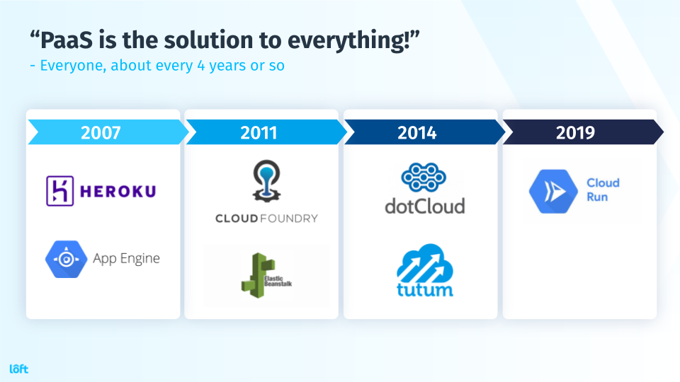 So in 2007, we had Heroku we had Google's app engine emerged, so that was like the OG pass essentially being created Heroku is still the gold standard for or a successful PaaS today but then again, like a couple of years later, there was another wave of PaaS with AWS jumping on the train, and cloud Foundry being created for the new Cloud world to essentially easily provision clouds and large enterprises. Then there was the whole Docker container ecosystem happening in the Cloud, which ultimately kind of turned into Docker. Those PaaS, you know, came a couple of years later, and today you know, we had been seeing PaaS emerge based on Kubernetes to kind of solve the complexities, you know, not of containers, not of cloud but of Kubernetes.