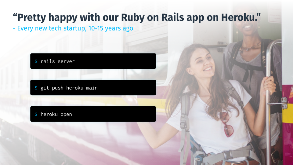 A lot of engineers actually are facing this right now, and so we're talking about it in this session because when we're thinking about our previous, you know, rails application. It was really like a real server to start it up, Heroku push to instantiate it. Heroku opened to get a URL if we're thinking about the same workflow with containers.