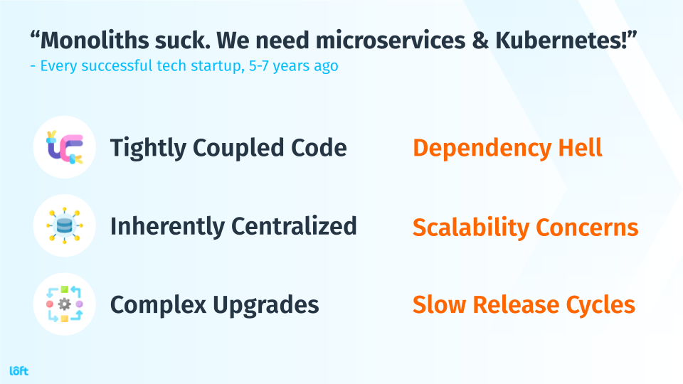 Monolith was not a great option anymore, right? They really sucked and everybody was like we need microservices we need Kubernetes. Kubernetes started to emerge and you know every every Tech startup started in that cycle essentially saw the issues of the of the monolith and why they were betting on a different technology. Applications can have a couple of issues, they're very tightly coupled so if you have a ruby application and you start out as a small startup that's in that's great right? Velocity is amazing, we can ship this pretty quickly, we can build new features and actually get that app out the door. Down the road we're going to have like so many different use cases the platform that we're building is expanding and ultimately this tight coupling turns into dependency hell because suddenly we have to have 10 people involved to figure out can we ship this new feature or will that break something else somewhere down the road in our monolith and that's pretty problematic. Ultimately we have where we have a very very centralized application driven monolith that means we have stability concerns in terms of if we're upgrading something. If we're changing something, does that affect something else right?