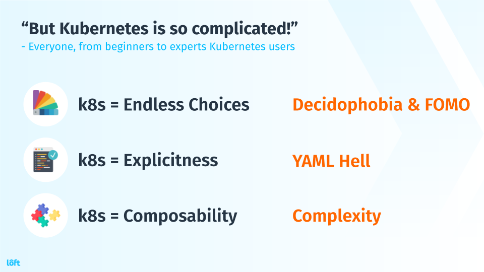 Kubernetes is also perceived as very complicated because it is very explicit. I see that as a benefit because it is Kubernetes is not a lot of magic so it's always clear what's happening right and there's always some kind of YAML option to tweak whatever you need to tweak for your specific scenario or use case but it leads to YAML hell.
