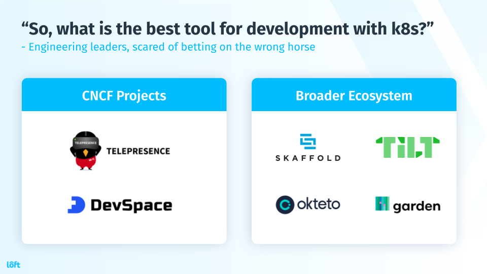 CNCF always has a great starting point there are two projects in the CNCF sandbox right now that you may want to consider telepresence they've been in the sandbox for years. They have the approach of “Hey you deploy your services”, how you deploy them we don't really cover that piece right we don't do image building we don't do hub install right like any of these things are covered but we're essentially deploying things. After it's deployed we're helping you now connect your localhost Dev environment to your remote deployed services so that you can run one service locally in any other microservices run inside the Kubernetes cluster and they do some network magic to essentially say hey your local service is now connecting with these remote services.
