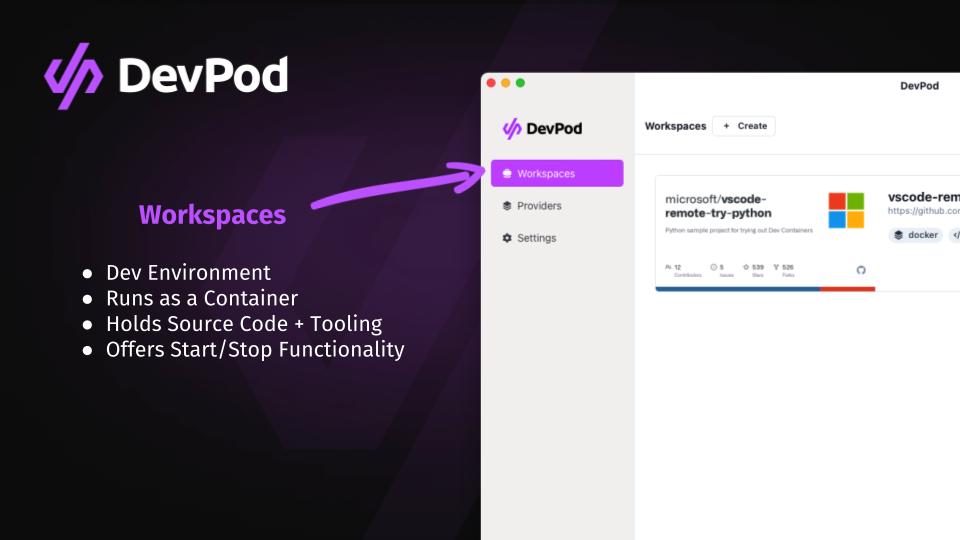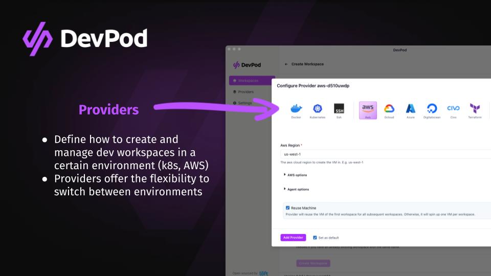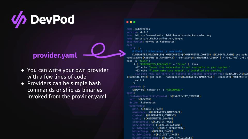 - Open-Source: DevPod is 100% open-source and extensible. A provider doesn't exist? Just create your own.
