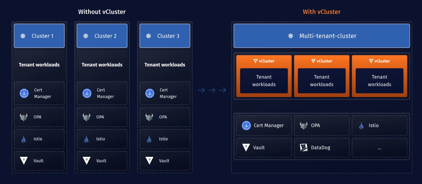 While the majority of the industry has overlooked these challenges initially, the further companies advance in their Kubernetes journey the more they feel the pain associated with these issues. That’s why we’re advocating for an architectural shift from single-tenant clusters to multi-clusters clusters and we invented vCluster as virtualization technology that makes it easier and more secure to set up multi-tenant Kubernetes clusters.