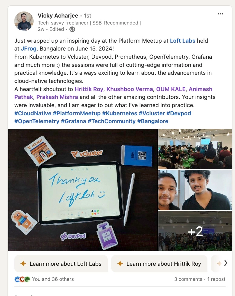 In the last few weeks, our social media channels were filled with pictures from the first Platform Meetup we hosted. This was the inaugural edition, and we had a lot of fun in Bengaluru, India, with exciting speakers sharing their knowledge on topics ranging from virtualization of Kubernetes clusters using vCluster and cloud development environments (DevPod) to observability and other exciting subjects.
