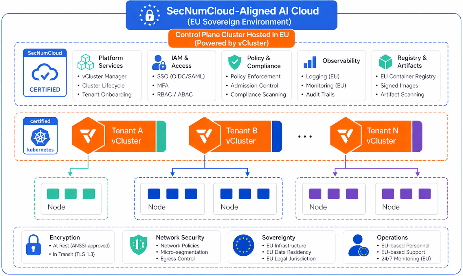 A typical architecture for an AI Cloud pursuing SecNumCloud compliance with vCluster includes: