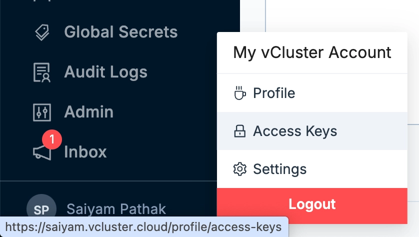 Or sign up on vCluster cloud and once you login, you should be able to go to access keys and create a short lived access key for the demo (Remember to delete the key post demo for security reasons)
