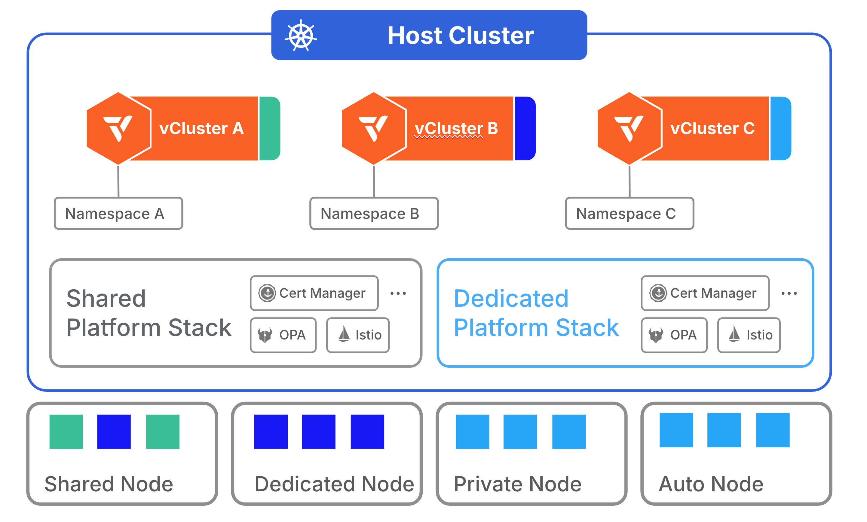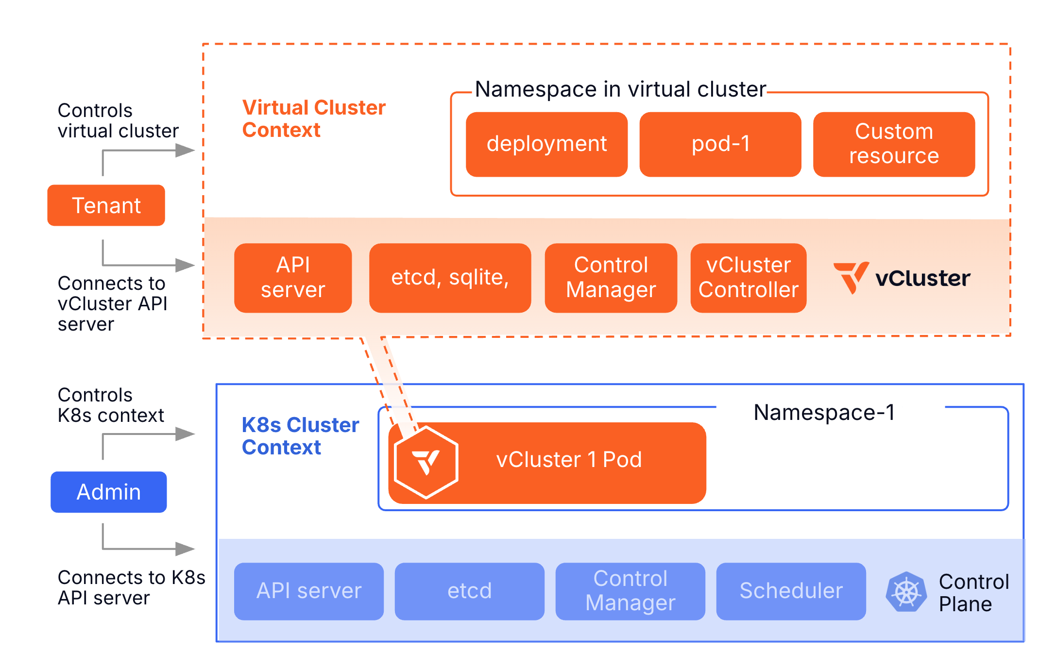 Each virtual cluster runs its own Kubernetes API server and control plane inside a namespace of a host cluster, giving teams autonomy and isolation without duplicating infrastructure.