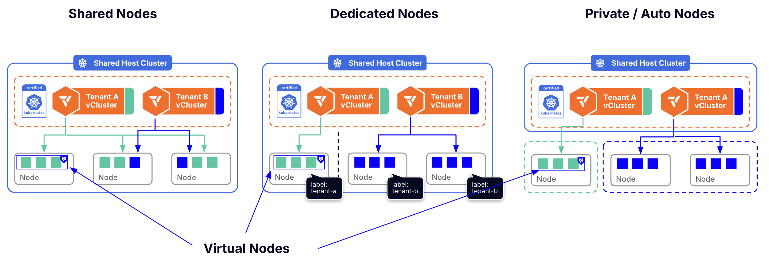 Isolation is configurable. In shared-node mode, vCluster workloads run as pods scheduled on the host’s nodes, with sync controllers mapping tenant resources to host equivalents. In dedicated-node mode, tenant workloads are confined to labeled subsets of host nodes, reducing cross-tenant interference. For maximum isolation, private-node mode attaches dedicated nodes directly to the vCluster, with its own CNI and CSI stack, ensuring strong compliance and workload separation.