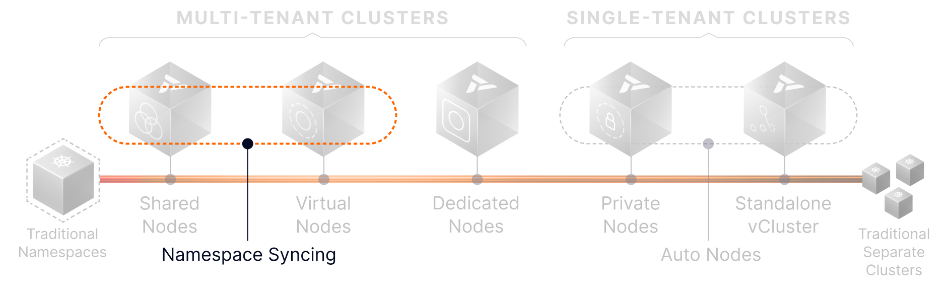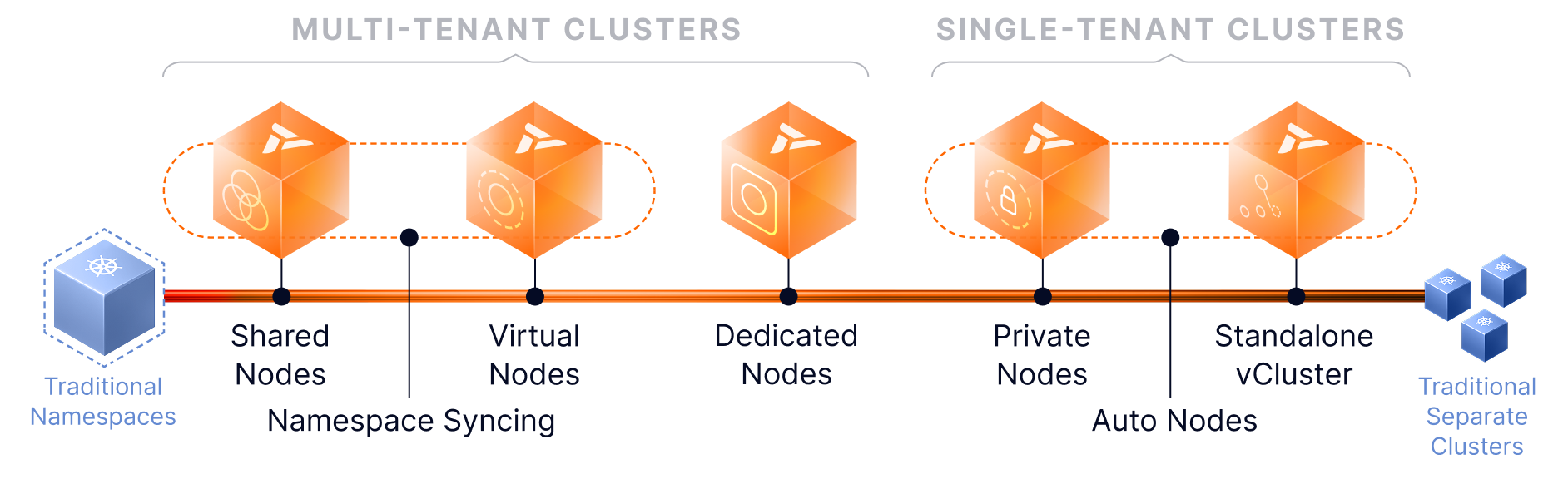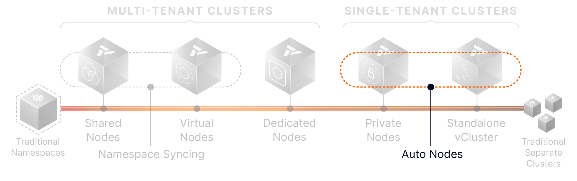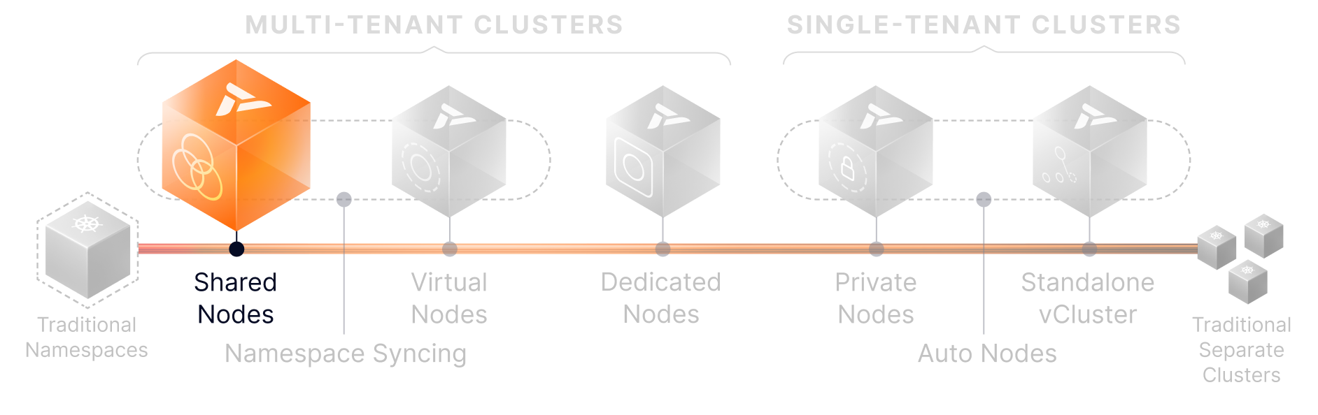 Start with Namespace Syncing or Shared Nodes. Grow into Dedicated or Private Nodes. Leverage Auto Nodes to keep infrastructure efficient at every step.
