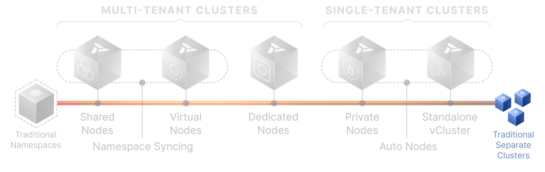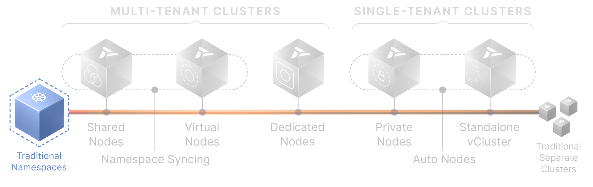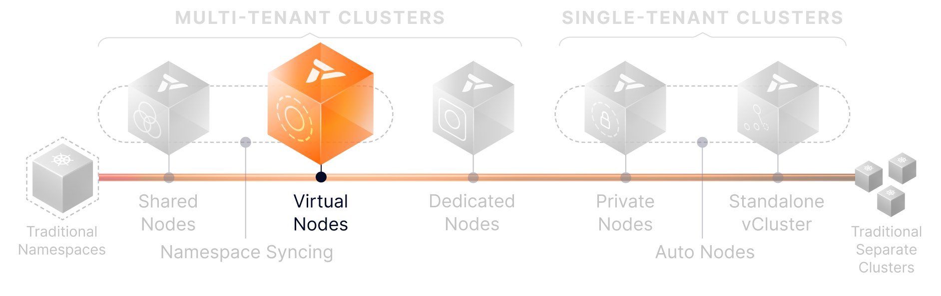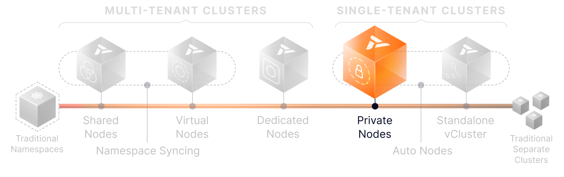 Start with Namespace Syncing or Shared Nodes. Grow into Dedicated or Private Nodes. Leverage Auto Nodes to keep infrastructure efficient at every step.