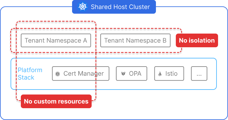 All tenants continue to use the same underlying control plane, scheduler, node pool, and extensions. Cluster-wide resources like CRDs and webhooks are still global, and a misconfigured tenant can easily impact others.