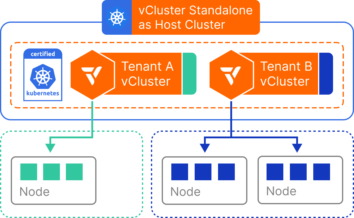 This model is ideal for use cases where speed, portability, or independence are paramount. Whether you’re running workloads in CI pipelines, demos, local development setups, or air-gapped environments, Standalone vCluster offers a fast, lightweight way to provision isolated Kubernetes environments without relying on cluster-level infrastructure or orchestration.