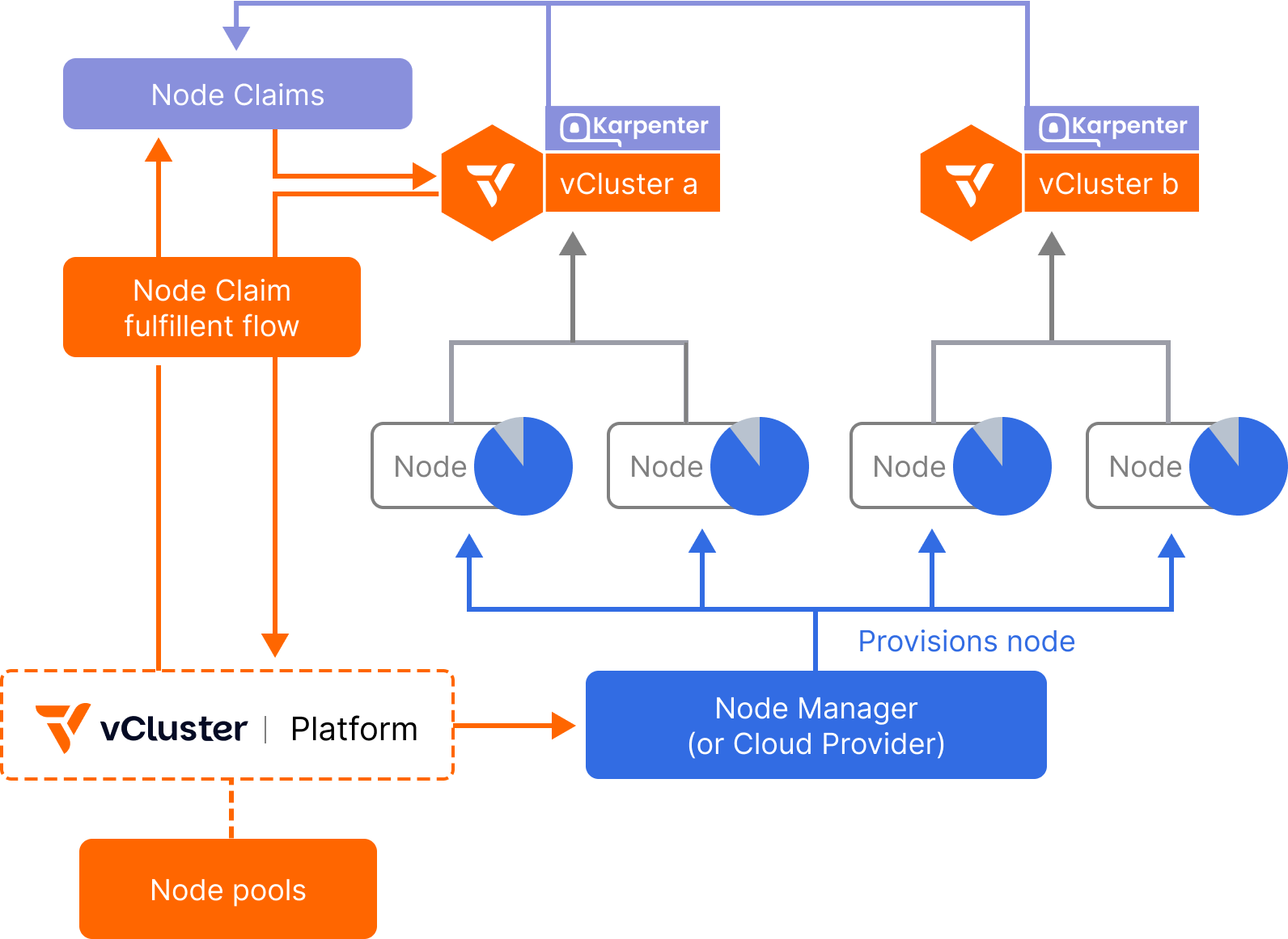 The vCluster Platform runs an embedded, fully configurable instance of Karpenter that listens to scheduling pressure and provisioning needs from all connected virtual clusters. When a virtual cluster’s scheduler detects the need for more compute (e.g., due to a pending pod), it submits a NodeClaim to the platform.