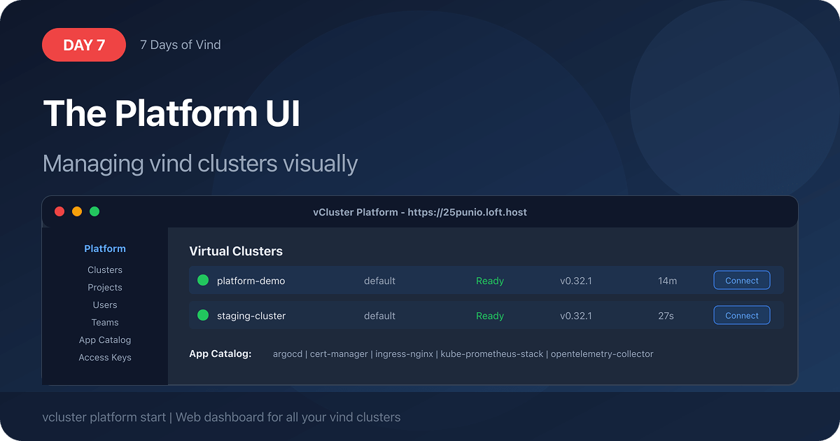 Launch the vCluster Platform as a Docker container alongside vīnd and get a full web UI to manage all your clusters visually. Observe workloads, inspect nodes, and share access with teammates.